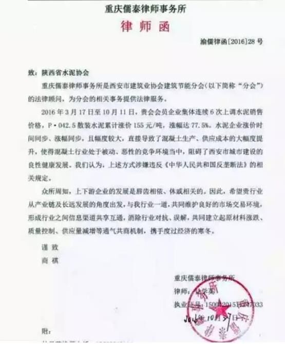 10月27日,鑒于陜西省內(nèi)水泥市場及混凝土市場發(fā)展情況,西安市建筑業(yè)協(xié)會(huì)建筑節(jié)能分會(huì)認(rèn)為這一市場情況違法了《中華人民共和國反壟斷法》的相關(guān)規(guī)定,并向陜西省水泥協(xié)會(huì)發(fā)律師函。希望水泥行業(yè)從產(chǎn)業(yè)鏈及長遠(yuǎn)發(fā)展的角度出發(fā),與混凝土行業(yè)一道,共同維護(hù)良好的市場交易環(huán)境,形成行業(yè)之間信息渠道共享互通,消除行業(yè)對(duì)抗、誤解,共同建立起原材料漲跌,質(zhì)量控制、供應(yīng)量減增等通氣共商機(jī)制,攜手度過經(jīng)濟(jì)寒冬。