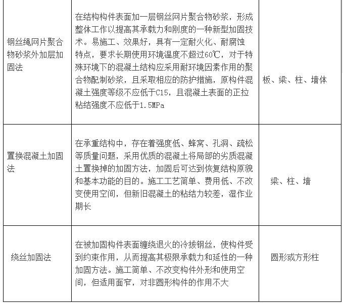 根據(jù)加固工程的特點,加固設計除要求做到技術(shù)安全可靠、經(jīng)濟合理、施工簡便、確保質(zhì)量、環(huán)保節(jié)能并滿足使用要求。以上是小編為大家總結(jié)的混凝土結(jié)構(gòu)常用加固方法概況: