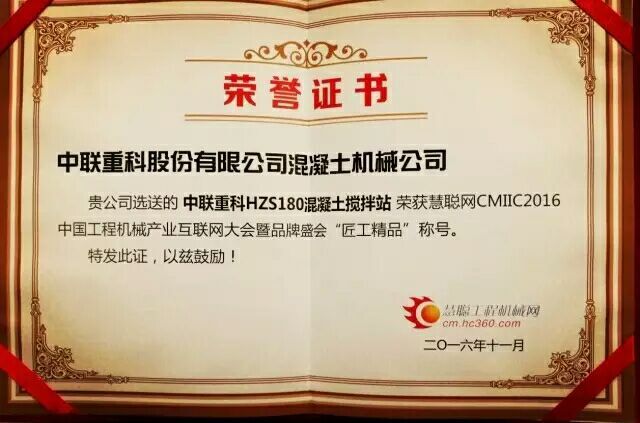 中聯(lián)重科HZSE180/HZS180產(chǎn)品4.0攪拌站榮獲CMIIC2016中國工程機械產(chǎn)業(yè)互聯(lián)網(wǎng)大會“匠工精品”稱號,這標志著中聯(lián)重科4.0攪拌站產(chǎn)品得到了行業(yè)的充分認可。