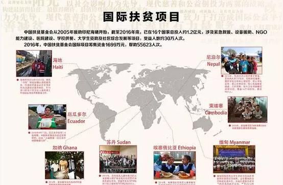 從2005年援助印尼海嘯開始,截至2016年底,中國扶貧基金會已在17個(gè)國家或地區(qū)總投入約1.12億元,涉及緊急救援、設(shè)備援助、NGO能力建設(shè)、醫(yī)院建設(shè)、學(xué)校供餐、大學(xué)生資助及社區(qū)綜合發(fā)展等項(xiàng)目,受益人數(shù)約30萬人次。2016年,我會國際項(xiàng)目籌集資金1699萬元,幫助55623人次。