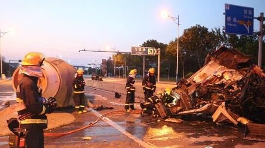 到達(dá)現(xiàn)場后,消防官兵經(jīng)過現(xiàn)場偵查發(fā)現(xiàn)水泥攪拌車與路中央護(hù)欄猛烈碰撞。事故中,攪拌車車頭損毀嚴(yán)重,車頭零部件散落一地,攪拌車司機(jī)被變形的車頭緊緊卡住,無法動彈,情況萬分危急。了解情況后,消防官兵決定利用液壓擴(kuò)張器和撐頂桿對駕駛室變形部位進(jìn)行破拆,對被困人員實施營救,并做好現(xiàn)場警戒,防止發(fā)生二次事故。