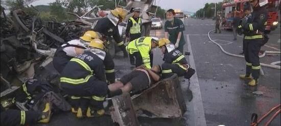 由于駕駛室變形嚴(yán)重,救援難度較大,為全力救出被困者,消防官兵首先利用擴(kuò)張器從左側(cè)車門擴(kuò)張,而后用撐頂桿對壓住被困者的變形車窗中間部位一點一點進(jìn)行擴(kuò)張,并小心翼翼地挪動被困者的身體,發(fā)現(xiàn)車門位置已經(jīng)變形卡主被困人員,現(xiàn)場指揮員果斷命令用無齒鋸對車門部位切割并用戰(zhàn)斗服蓋住被困人員防止?fàn)C傷,水槍一直保持充實水柱狀態(tài)。