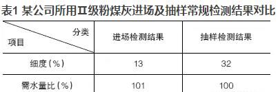 優(yōu)質(zhì)的粉煤灰摻入混凝土可明顯地改善混凝土的和易性,當(dāng)粉煤灰摻量大于膠材總量的5%~10%時(shí),效果極為明顯?,F(xiàn)今在混凝土實(shí)際生產(chǎn)中,粉煤灰摻量往往達(dá)到20%,有的甚至高達(dá)30%,但混凝土的和易性卻不盡人意。抽取原材料進(jìn)行檢測時(shí),發(fā)現(xiàn)粉煤灰的檢測結(jié)果經(jīng)常不滿足標(biāo)準(zhǔn)要求或者與驗(yàn)收時(shí)的結(jié)果相差甚遠(yuǎn)?,F(xiàn)以某公司所用Ⅱ級(jí)粉煤灰進(jìn)場及抽樣常規(guī)檢測結(jié)果進(jìn)行對比,見表1。