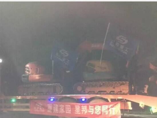 當晚在重災區(qū)壩塘鎮(zhèn),星邦重工組織的6臺挖機連夜運到,同時到達的還有災區(qū)急需的物資。
