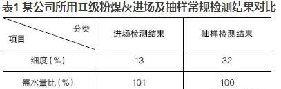 優(yōu)質(zhì)的粉煤灰摻入混凝土可明顯地改善混凝土的和易性,當(dāng)粉煤灰摻量大于膠材總量的5%~10%時,效果極為明顯。現(xiàn)今在混凝土實際生產(chǎn)中,粉煤灰摻量往往達(dá)到20%,有的甚至高達(dá)30%,但混凝土的和易性卻不盡人意。抽取原材料進(jìn)行檢測時,發(fā)現(xiàn)粉煤灰的檢測結(jié)果經(jīng)常不滿足標(biāo)準(zhǔn)要求或者與驗收時的結(jié)果相差甚遠(yuǎn)?,F(xiàn)以某公司所用Ⅱ級粉煤灰進(jìn)場及抽樣常規(guī)檢測結(jié)果進(jìn)行對比,見表1。