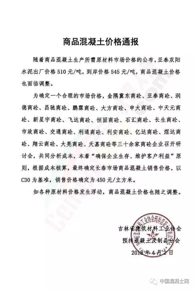 為確定一個合理的市場價格,金隅冀東商砼、亞泰商砼、潤德商砼、昌馳商砼、鵬霖商砼、大方商砼、中天元商砼、新星宇商砼、飛達商砼、石匯商砼、長生商砼、市政商砼、交通商砼、利通商砼、利安商砼、億達商砼、煜達商砼、翔云商砼、大亮商砼、天嘉商砼等三十余家商砼企業(yè)召開研討會,共同分析,本著“確保企業(yè)生存、維護客戶利益”原則,根據(jù)成本核算,最終確定長春市場商品混凝土銷售價格,以C30為基準,銷售價格確定為450元/立方米。