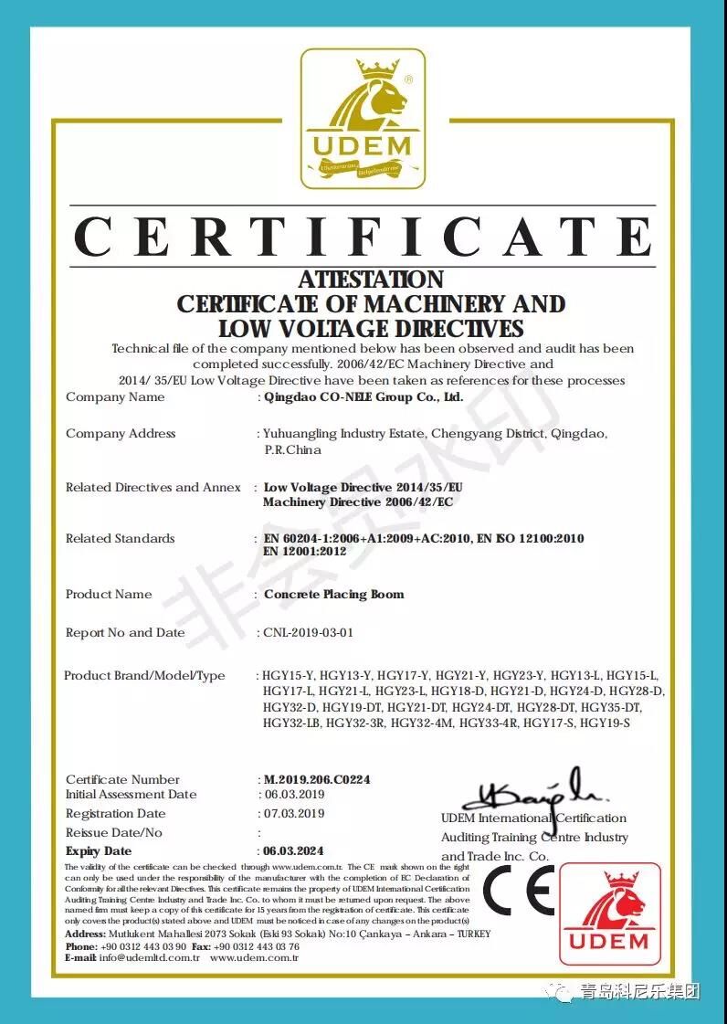 陽春三月,微風(fēng)習(xí)習(xí),科尼樂集團的明星產(chǎn)品混凝土泵、混凝土布料機順利通過了歐盟CE認證,這也代表著科尼樂集團在提升產(chǎn)品品質(zhì)、拓展銷路、提升企業(yè)競爭力方面邁入了新臺階。