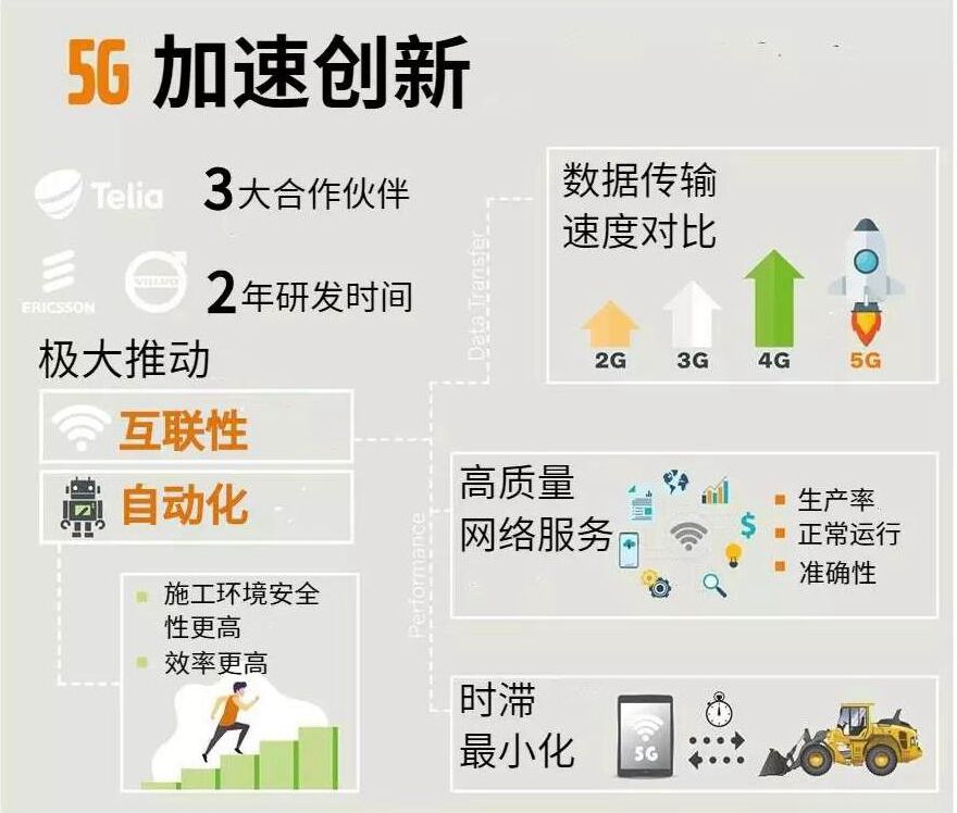2019年3月,沃爾沃建筑設備攜手瑞典電信運營商特利亞(Telia)和愛立信啟動了瑞典首個工業(yè)5G網(wǎng)絡,將用于遠程控制輪式裝載機測試。憑借極短的響應時間、大容量、高度的移動網(wǎng)絡可接入性,5G技術(shù)能為提高效率、降低成本和降低環(huán)境風險。