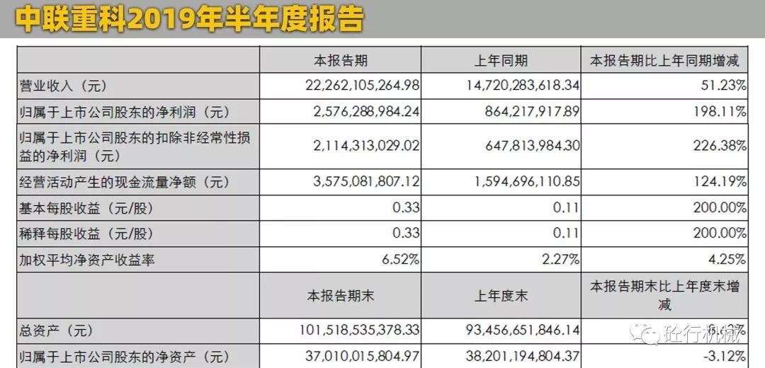 2019年上半年營業(yè)收入:222.62億元8月30日晚,中聯(lián)重科官方發(fā)布了2019年半年度報告。報告顯示,中聯(lián)重科上半年實現(xiàn)營業(yè)總收入222.6億元,同比增長51.23%;包括海外市場實現(xiàn)營業(yè)收入16.84億元,同比增長2.61%。歸屬于上市公司股東的凈利潤25.76億元,同比增長198.11%。相比較上面的徐工機械,雖然總營業(yè)額相差了88個多億,但是,凈利潤比徐工多了2.93億元。所以,從盈利能力來說,中聯(lián)表現(xiàn)比徐工要好。中聯(lián)重科的優(yōu)勢產(chǎn)業(yè)主要集中在混凝土機械、塔式起重機械、環(huán)衛(wèi)機械、農(nóng)業(yè)機械這四個領(lǐng)域為主,其中,建筑起重機械、長臂架泵車保持行業(yè)第一,汽車起重機國內(nèi)市場份額較年初增長6.8%。從目前中聯(lián)的發(fā)展趨勢來看,也在積極的擴展高空作業(yè)平臺、土方機械、機制砂、干混砂漿、噴射機械手等新興業(yè)務。與此同時,中聯(lián)重科目前也在積極轉(zhuǎn)型,打造人工智能和智能制造,中聯(lián)重科塔機智能工廠穩(wěn)步達產(chǎn),高空作業(yè)平臺臂式智能產(chǎn)線實現(xiàn)量產(chǎn),攪拌車智能制造產(chǎn)業(yè)園、液壓關(guān)鍵元件產(chǎn)業(yè)園處于規(guī)劃建設(shè)中。作為老牌的國產(chǎn)工程機械品牌,中聯(lián)重科一直以來擁有很好的品牌口碑,特別是在混凝土機械領(lǐng)域,擁有眾多的明星產(chǎn)品,碳纖維長臂架泵車,國內(nèi)首創(chuàng),大受市場歡迎。