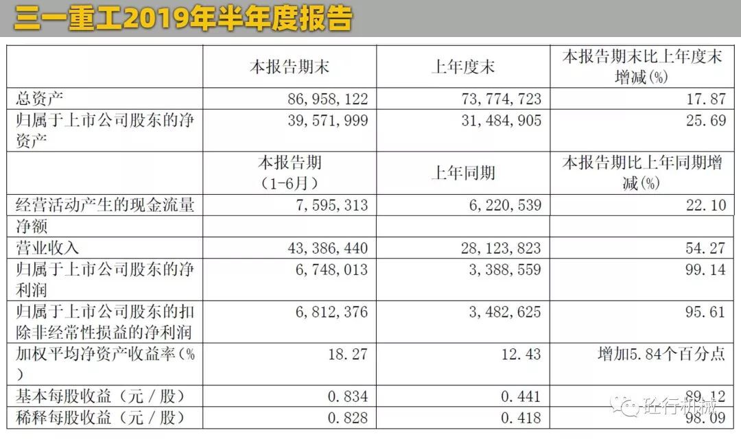 8月29日晚,三一重工官方發(fā)布了其2019年上半年業(yè)績公告。上半年,公司實現(xiàn)營業(yè)總收入433.86億元,同比增長54.27%;包括三一國際銷售收入70.26億元,同比增長15.34%。歸屬于上市公司股東的凈利潤67.48億元,同比增長99.14%。對比之下,不管是營收能力,還是賺錢能力,三一重工都是最強的,凈利潤更是比徐工和中聯(lián)凈利潤的總和還要多將近一倍,民營重工第一品牌當之無愧。