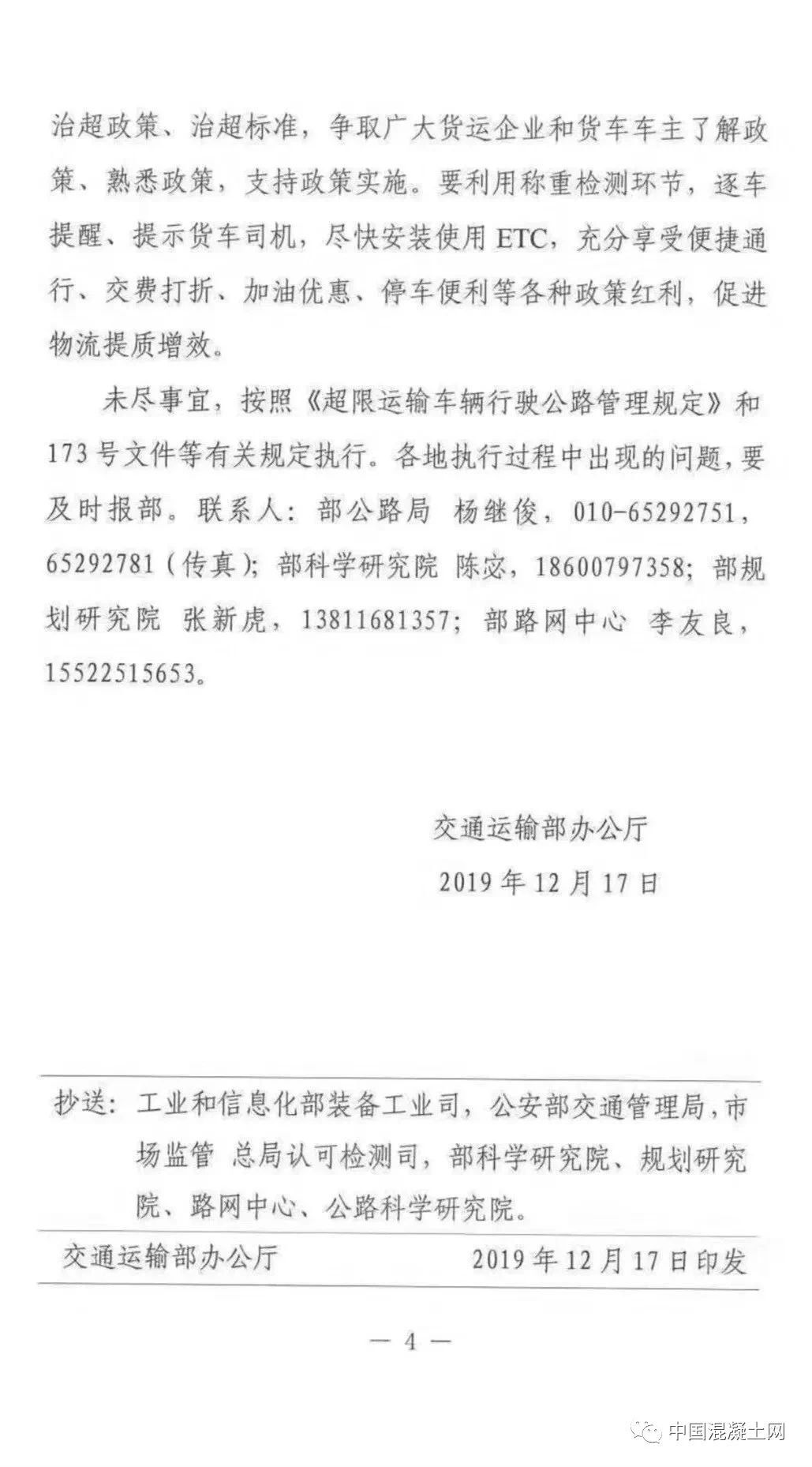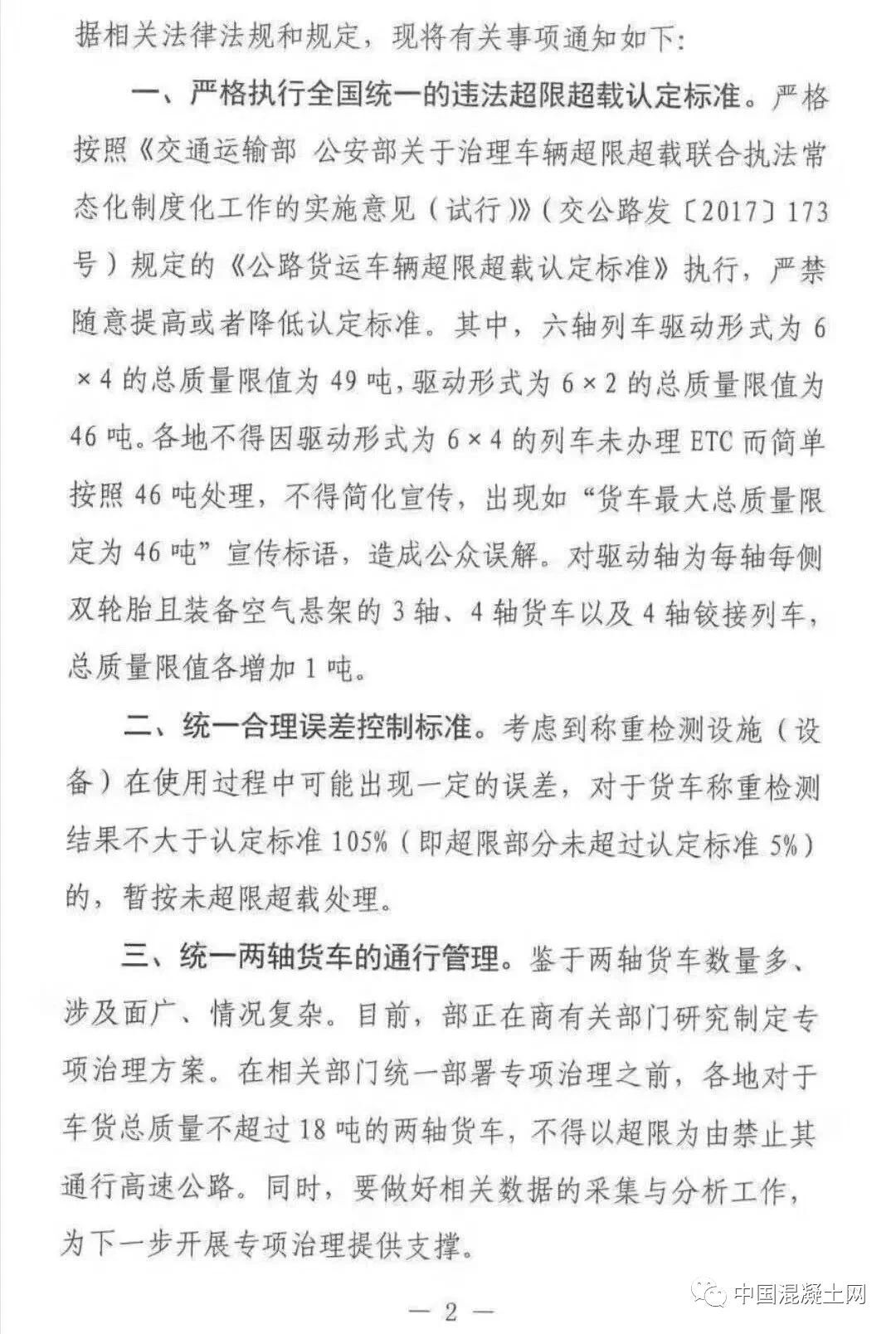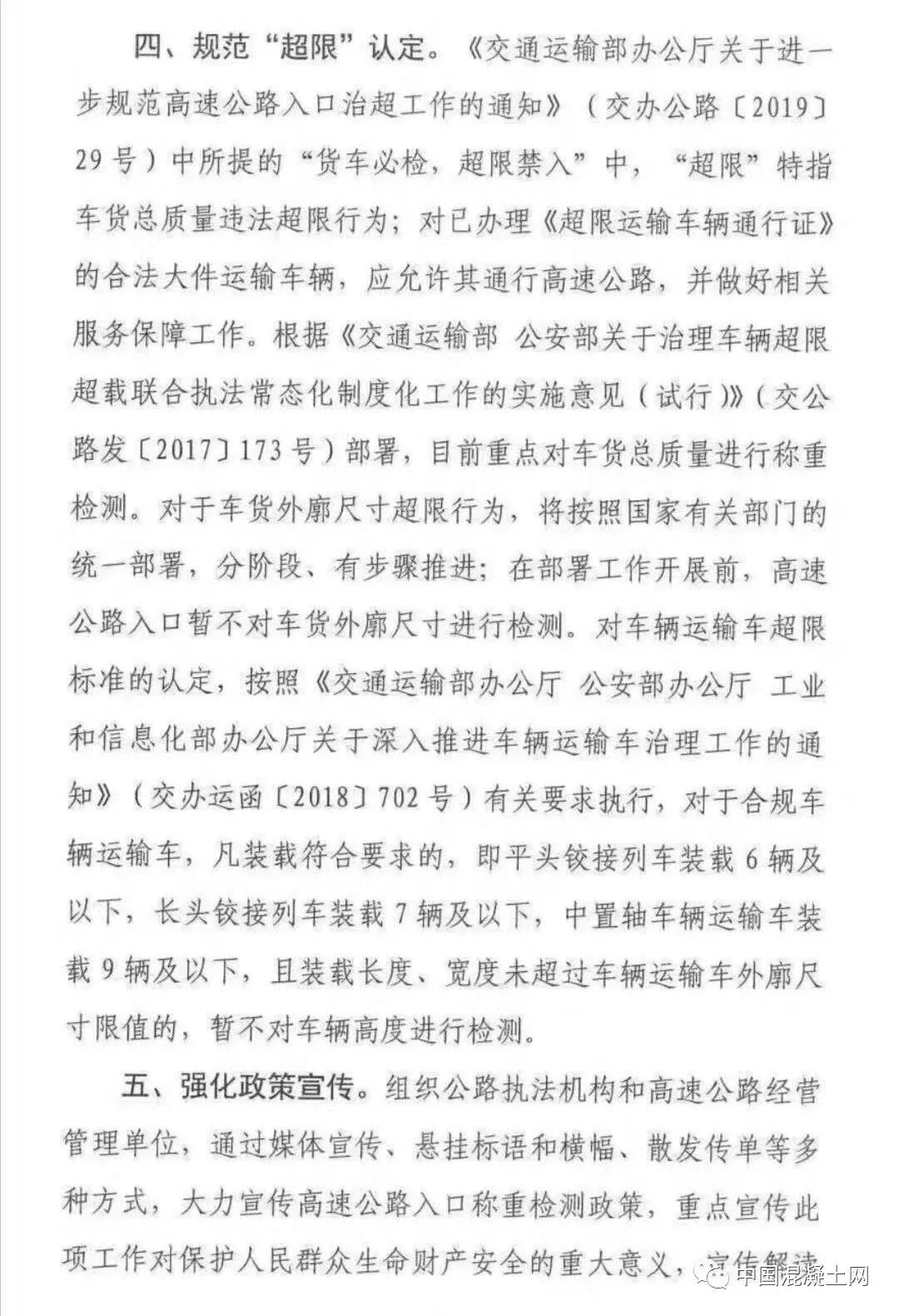 一、嚴(yán)格執(zhí)行全國(guó)統(tǒng)一的違法超限超載認(rèn)定標(biāo)準(zhǔn)。嚴(yán)格按照《交通運(yùn)輸部 公安部關(guān)于治理車輛超限超開車聯(lián)合執(zhí)法常態(tài)化制度化工作的實(shí)施意見 (試行)》(交公路發(fā)【2017】173號(hào))規(guī)定的《公路貨運(yùn)車輛超限超載認(rèn)定標(biāo)準(zhǔn)》執(zhí)行,嚴(yán)禁隨意提高或者降低認(rèn)定標(biāo)準(zhǔn)。其中,六軸列車驅(qū)動(dòng)形式為6×4的總質(zhì)量限值為49噸,驅(qū)動(dòng)形式為6×2的總質(zhì)量限值為46噸。各地不得因驅(qū)動(dòng)形式為6×4人列車未辦理ETC而簡(jiǎn)單按照46噸處理,不得簡(jiǎn)化宣傳,出現(xiàn)如“貨車最大總質(zhì)量限定為46噸”宣傳標(biāo)語,造成公眾誤解。對(duì)驅(qū)動(dòng)軸為每軸每則雙輪胎且裝備空氣懸架的3軸、車軸貨車以及4軸鉸接列車總質(zhì)量限值各增加1噸。二、統(tǒng)一合理誤差控制標(biāo)準(zhǔn)。考慮到稱重檢測(cè)設(shè)施(設(shè)備)在使用過程中可能出現(xiàn)一定的誤差,對(duì)于貨車稱重檢測(cè)結(jié)果不大于認(rèn)定標(biāo)準(zhǔn)105%(即超限部分未直如過認(rèn)定標(biāo)準(zhǔn)的5%)的,暫按未超限超載處理。鑒于兩軸貨車數(shù)量多、涉及面廣、情況復(fù)雜。目前,部正在商有關(guān)部門研究制定專項(xiàng)治理方案。在相關(guān)部門統(tǒng)一部署專項(xiàng)治理之前,各地對(duì)于車貨總質(zhì)量不超過18噸的兩軸貨車,不得以超限為由禁止其通行高速公路。同時(shí),要做好相關(guān)數(shù)據(jù)的采集與分析工作,為下一步開展專項(xiàng)治理提供支撐。《交通運(yùn)輸部辦公室廳關(guān)于進(jìn)一步規(guī)范高速公路入口治超工作的通知》(交辦公路【2019】29號(hào))中所提的“貨車必檢,超限禁入”中,“超限”特指車貨總質(zhì)量違法超限行為;對(duì)已辦理《超限運(yùn)輸車輛通行證》的合法大件運(yùn)輸致車輛,應(yīng)允許其通行高速公路,并做好相關(guān)服務(wù)保障工作。根據(jù)《交通運(yùn)輸部 公安部關(guān)于治理車輛超限超載聯(lián)合執(zhí)法常態(tài)化制度化工作的實(shí)施意見(試行)》(交公路發(fā)【2017】173號(hào))部署,目前重點(diǎn)對(duì)車貨總質(zhì)量進(jìn)行稱重檢測(cè)。對(duì)于車貨外廓尺寸超限行為,將按照國(guó)家有關(guān)部門的統(tǒng)一部署,分階段、有步驟推進(jìn);在部署工作開展前,高速公路入口暫不對(duì)車貨外廓尺寸進(jìn)行檢測(cè)。對(duì)車輛運(yùn)輸超限標(biāo)準(zhǔn)的認(rèn)定,按照《交通運(yùn)輸 部辦公室廳 公安部辦公室廳 工業(yè)和信息化部辦公室廳關(guān)于深入推進(jìn)車輛運(yùn)輸車治理工作的通知》(交辦運(yùn)【2018】702號(hào))有關(guān)要求執(zhí)行,對(duì)于合規(guī)車輛運(yùn)輸車,凡裝載符合要求的,即平頭鉸接列車裝載6輛及以下,長(zhǎng)頭鉸接列車裝載7輛及以下,中置軸車輛運(yùn)輸車裝載9輛及以下,且裝載長(zhǎng)度、寬度未超過車輛運(yùn)輸車外廓尺寸限值的,暫不對(duì)車輛高度進(jìn)行檢測(cè)。組織公路執(zhí)法機(jī)構(gòu)和高速公路經(jīng)營(yíng)管理單位,通過媒體宣傳、懸掛標(biāo)語和橫幅、散發(fā)傳單等多種方式,大力宣傳高速公路入口稱重檢測(cè)政策,重點(diǎn)宣傳此項(xiàng)工作對(duì)保護(hù) 人民群眾生命財(cái)產(chǎn)安全的重大意義 ,宣傳解讀治超政策、治超標(biāo)準(zhǔn),爭(zhēng)取廣大貨運(yùn)企業(yè)和貨車車主了解政策、熟悉政策,支持政策實(shí)施。要利用稱重檢測(cè)環(huán)節(jié),逐車提醒、提示貨車司機(jī),盡快安裝ETC,充分享受便捷通行、交費(fèi)打折、加油優(yōu)惠、車便利等各種政策紅利,促進(jìn)物流提質(zhì)增效。未盡事宜,按照《超限運(yùn)輸車輛行駛公路管理規(guī)定》和173號(hào)文件等有關(guān)規(guī)定執(zhí)行。各地執(zhí)行過程中出現(xiàn)的要及時(shí)報(bào)部。全國(guó)物流標(biāo)準(zhǔn)非?;靵y,地方標(biāo)準(zhǔn)與國(guó)家標(biāo)準(zhǔn)經(jīng)?!按蚣堋保瑢?dǎo)致全國(guó)物流司機(jī)苦不堪言,而此次交通廳像各省運(yùn)輸廳發(fā)布特急文件通知,劍指就是統(tǒng)一運(yùn)輸車輛載重的標(biāo)準(zhǔn),令運(yùn)輸行業(yè)向制度化,規(guī)范化過渡。同時(shí)從根源上徹底清除“亂收費(fèi)”現(xiàn)象,并發(fā)布問題反映電話:部科學(xué)研究院:陳宓 18600797358部規(guī)劃院:張新虎 13811681357部路網(wǎng)中心:李友良 15522515653