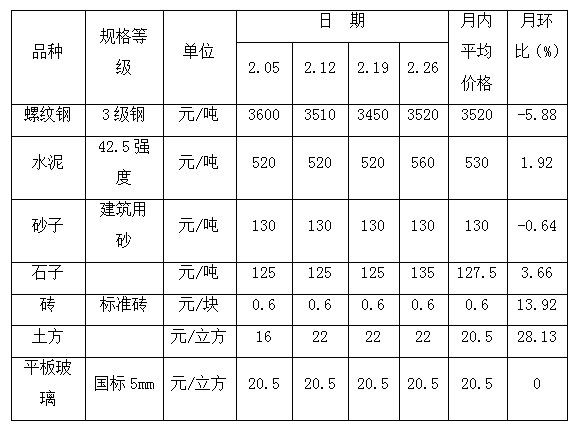 受春節(jié)假期和新冠肺炎疫情影響,2月份山東省濟(jì)寧市黃河灘區(qū)遷建物資市場交易量明顯減少,價(jià)格變動整體漲跌互現(xiàn)。與上月相比,7種黃河灘遷建物資價(jià)格呈4升2降1平態(tài)勢。其中,螺紋鋼的價(jià)格震蕩下行,水泥的價(jià)格穩(wěn)中有漲,砂子、磚和平板玻璃的價(jià)格月內(nèi)平穩(wěn)運(yùn)行,石子的價(jià)格受季節(jié)性供應(yīng)減少影響小幅上升,土方的價(jià)格呈現(xiàn)高位整理態(tài)勢。螺紋鋼方面,截止到2月26日,濟(jì)寧市梁山縣監(jiān)測的螺紋鋼市場批發(fā)價(jià)格為3520元/噸,價(jià)格下降明顯。由于目前特殊時(shí)期,貨運(yùn)受阻且下游企業(yè)復(fù)工進(jìn)度開展緩慢,短期內(nèi)需求仍然偏弱,市場整體成交冷清,庫存和資金壓力逐步增加,供給壓力放大,商家對于后市心態(tài)偏空,處于悲觀情緒,市場整體處于有價(jià)無市狀態(tài)。