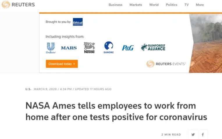 據(jù)路透社3月9日?qǐng)?bào)道,美國國家航空航天局(NASA)位于加利福尼亞州的艾姆斯研究中心3月8日發(fā)表聲明稱,該中心一員工新冠病毒檢測(cè)呈陽性。出于謹(jǐn)慎考慮,該中心要求其他員工在家工作,直到另行通知。