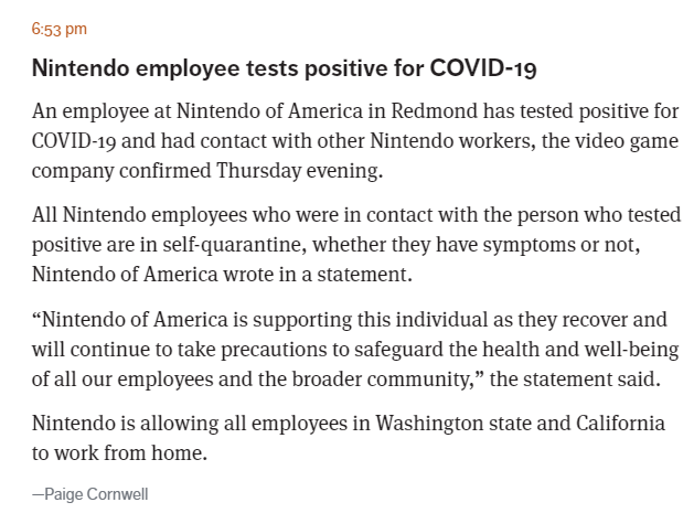 根據(jù)《西雅圖時(shí)報(bào)》的相關(guān)報(bào)道,美國任天堂一名員工目前已經(jīng)出現(xiàn)“新冠病毒檢測(cè)陽性”的狀況,目前,與這位員工有過接觸的其他人員已經(jīng)開始自我隔離?!段餮艌D時(shí)報(bào)》報(bào)道原文: