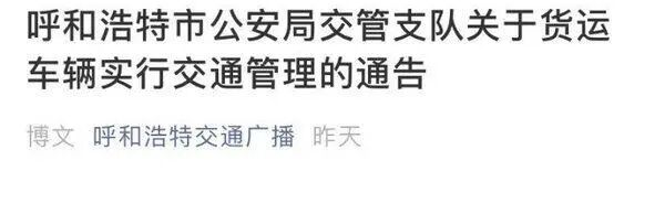 日前,呼和浩特市公安局交管支隊(duì)發(fā)布通告表示:6月28日起,對(duì)貨運(yùn)車輛采取交通管理措施。