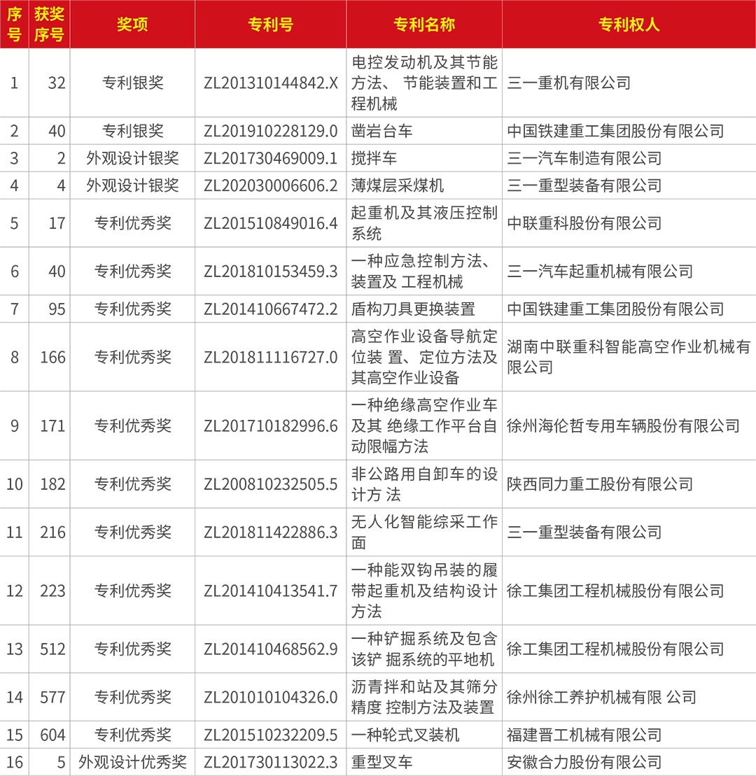 本屆評選活動中,中國工程機(jī)械行業(yè)共有十六項(xiàng)專利榮獲“中國專利獎”,其中兩項(xiàng)獲專利銀獎,兩項(xiàng)獲外觀設(shè)計(jì)銀獎,十一項(xiàng)獲專利優(yōu)秀獎,一項(xiàng)獲外觀設(shè)計(jì)優(yōu)秀獎。
