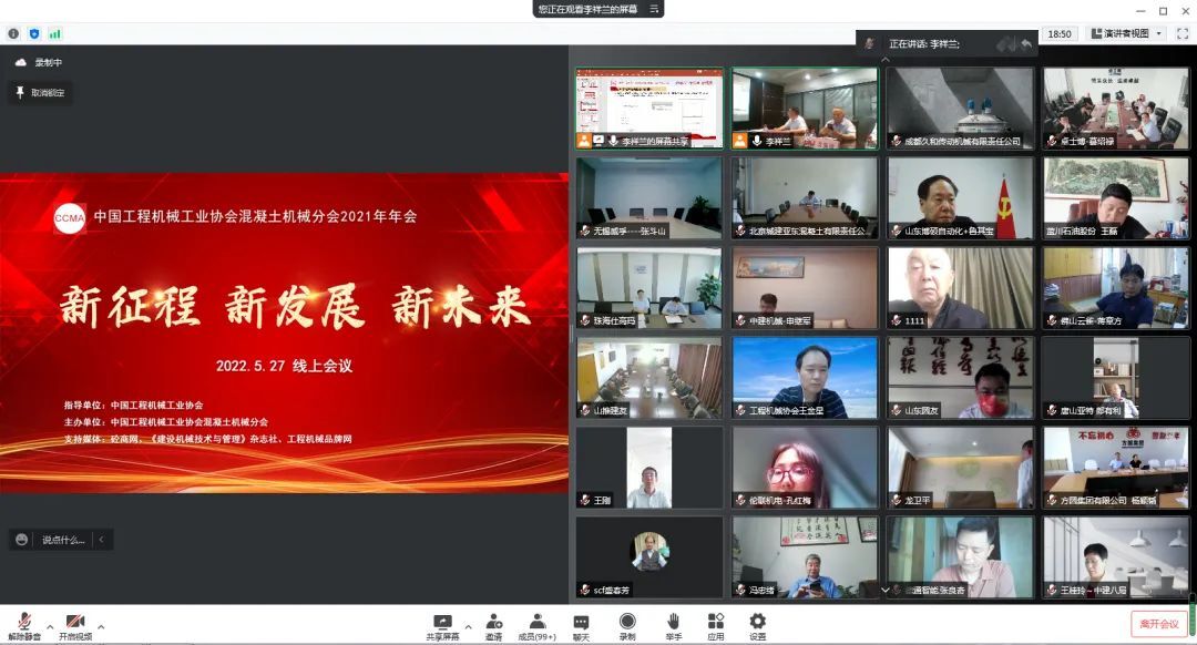 2022年5月27日,以“新征程 新發(fā)展 新未來 ”為主題的中國工程機械工業(yè)協(xié)會混凝土機械分會年會在線上隆重召開。中國工程機械工業(yè)協(xié)會會長蘇子孟、名譽會長祁俊、協(xié)會顧問龍國鍵、副秘書長呂瑩、副秘書長王金星、副秘書長尹曉荔、其他分支機構(gòu)領(lǐng)導(dǎo)、混凝土機械分會會長符忠軒、名譽會長盛春芳、秘書長李祥蘭、顧問易君、分會秘書處、分會理事及會員單位相關(guān)負責(zé)人、行業(yè)上下游企業(yè)與行業(yè)專家等在內(nèi)的兩百余人參與此次會議。