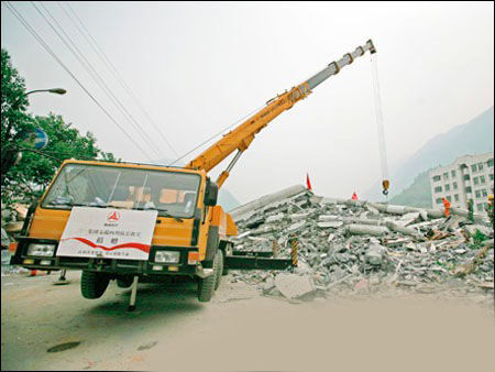 三一7臺(tái)挖掘機(jī)、8臺(tái)起重機(jī)以及80多名具有設(shè)備操作經(jīng)驗(yàn)的青年員工組成抗震救災(zāi)志愿者突出隊(duì),受命開赴災(zāi)區(qū)。