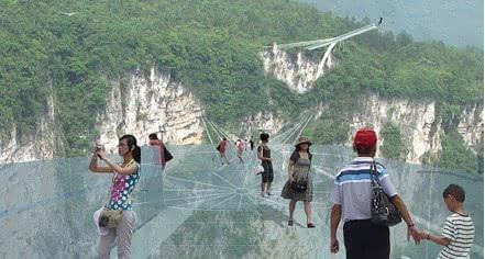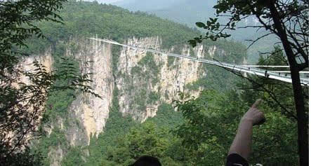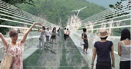 號(hào)稱世界最長、最高的全透明玻璃橋———據(jù)遺產(chǎn)日?qǐng)?bào): 張家界大峽谷玻璃橋?qū)⒂?月向游客開放。玻璃橋總長430米、寬6米,橋面距谷底約300米,可站800人。整個(gè)工程無鋼筋混凝土橋墩,同時(shí)肩負(fù)蹦極、溜索、舞臺(tái)等多種功能。