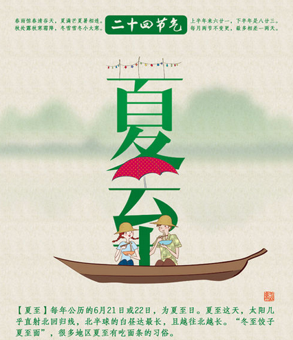夏至是二十四節(jié)氣中最早被確定的一個節(jié)氣。公元前七世紀,先人采用土圭測日影,就確定了夏至。每年的夏至從6月21日(或22日)開始,至7月7日(或8日)結(jié)束。據(jù)《恪遵憲度抄本》:“日北至,日長之至,日影短至,故曰夏至。至者,極也?!毕闹吝@天,太陽直射地面的位置到達一年的最北端,幾乎直射北回歸線(北緯23°26\'),北半球的白晝達最長,且越往北晝越長。如海南的海口市這天的日長約13小時多一點,杭州市為14小時,北京約15小時,而黑龍江的漠河則可達17小時以上。夏至以后,太陽直射地面的位置逐漸南移,北半球的白晝?nèi)諠u縮短。民間有“吃過夏至面,一天短一線”的說法。而此時南半球正值隆冬。