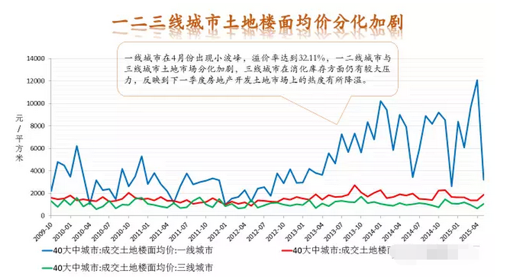 從不同級別的城市看,一線城市環(huán)比3月上漲幅度達到14.1%,漲幅最大,二線城市漲幅也達到7.3%。而三四線城市則并不樂觀,整體市場走勢出現了明顯的分化趨勢。