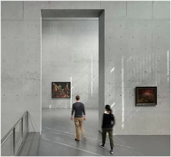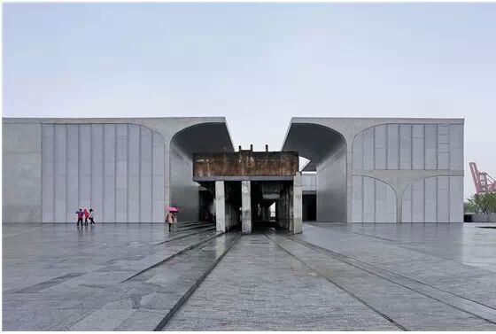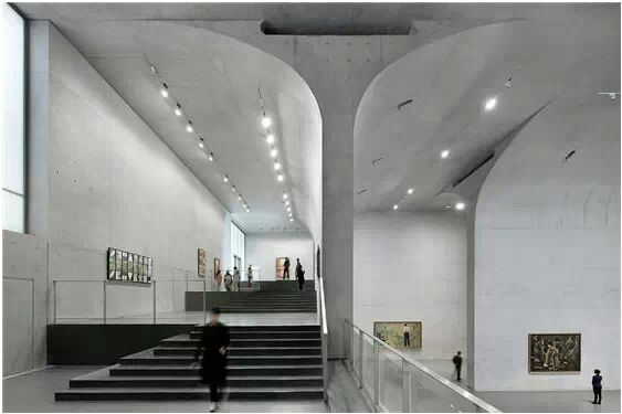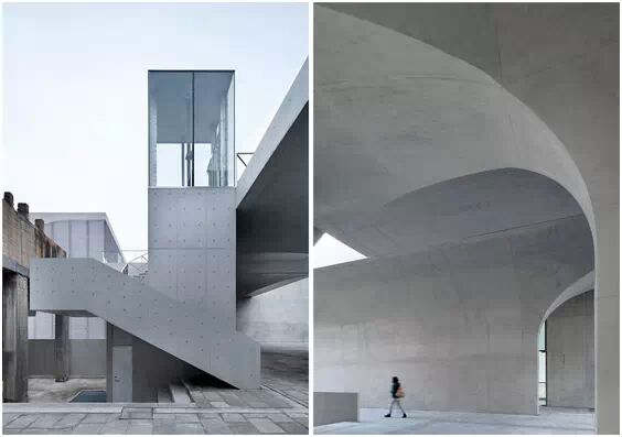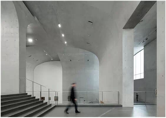 在“傘拱”結(jié)構(gòu)的空腔里,地面以上的“傘拱”覆蓋空間,墻體和天花均為清水混凝土的表面,它們的幾何分界位置也變得模糊。這樣的結(jié)構(gòu)性空間,在形態(tài)上不僅對人的身體形成庇護感,亦與保留的江邊碼頭的煤料斗產(chǎn)生視覺呼應(yīng)。建筑的內(nèi)部空間也得以呈現(xiàn)一種原始的野性魅力,而有著大小調(diào)節(jié)的空間尺度以及留有模板拼縫和螺栓孔的清水混凝土表面又會帶來一種現(xiàn)實感。這種“直白”式的結(jié)構(gòu)、材料、空間所形成的直接性與樸素性,加上大尺度出挑所產(chǎn)生的力量感或輕盈感,使整個建筑與原有場地的工業(yè)特質(zhì)間取得一種時間與空間的接續(xù)關(guān)系。地面以上的清水混凝土“傘拱”下的流動展覽空間和地下一層傳統(tǒng)“白盒子”式的展覽空間由一個呈螺旋回轉(zhuǎn)、層層跌落的階梯空間聯(lián)接,既原始又現(xiàn)實的空間和古代、近代、現(xiàn)代直到當代藝術(shù)的展覽陳列,這種并置的張力,呈現(xiàn)出一種具有時間性的展覽空間。