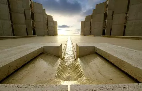路易斯·康設計的加利福尼亞索爾克研究所,是一件大師級的作品。這里既是“具有學術(shù)氛圍的隱居之所”,也是科學研究的靈感之地?;炷恋臐仓?,利用了從羅馬建筑研究汲取的技術(shù)。為了充分體現(xiàn)混凝土材料的特色,建筑師在材料設計完成后沒有再做任何的裝飾。