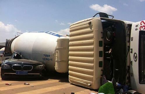 景明北路與陽春大道交叉口處有多條明顯的剎車痕跡,其中一條較寬疑似攪拌車的剎車痕跡長約二三十米。牌照為云ABXX20的攪拌車向右側(cè)翻后,駕駛室受損嚴(yán)重,玻璃脫落,車內(nèi)物品散落一地。倒下的罐體壓住了一輛黑色云A6XXVS牌照的寶馬740i轎車,轎車的整個(gè)左半邊幾乎被壓平,整車車胎全部爆裂,尤其是駕駛室被壓得最為嚴(yán)重,站在車外根本看不見內(nèi)部情況。有現(xiàn)場目擊者稱,當(dāng)時(shí)攪拌車側(cè)翻壓到寶馬車之后,車子還往前硬生生推出了近30米。
