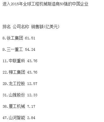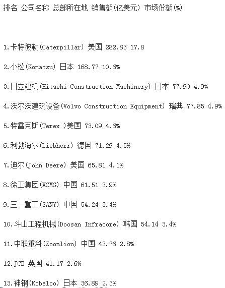 分析指出,受大宗商品價格下跌、新型經濟體經濟增速減緩和世界經濟不景氣的影響,全球前50家工程機械制造企業(yè)總產值較上一年度下跌16.2%,達到1330億美元,創(chuàng)2009年以來新低。據(jù)中國工程機械商貿網(wǎng)編輯了解,2009年,工程機械行業(yè)一年銷售額下降了1090億美元。自那時起,工程機械行業(yè)收入下降趨勢一直未有改變。報告同時強調,榜單上下滑最為嚴重的是中國企業(yè),這很大程度上是因為中國經濟增速的放緩。中國企業(yè)中,只有徐工集團仍然保持在前十強,位列榜單第九位?!斑@個市場趨勢表現(xiàn)最顯著的就是中國建筑設備制造商,相比去年,所有中國企業(yè)的排名有所下滑。排名前十的企業(yè)中,如今只有徐工一家中國工程機械制造廠商。”