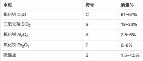 這里是硅酸鹽水泥熟料(水泥的干粉版本)的一般配方。配比隨應用變化,取決于水泥所需的材料性能。