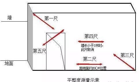 三、表面平整度1、指標(biāo)說(shuō)明:反映層高范圍內(nèi)剪力墻、混凝土柱表面平整程度。2、測(cè)量工具:2米靠尺、楔形塞尺3、測(cè)量方法和數(shù)據(jù)記錄:(1)剪力墻/暗柱:選取長(zhǎng)邊墻,任選長(zhǎng)邊墻兩面中的一面作為1個(gè)實(shí)測(cè)區(qū)。累計(jì)實(shí)測(cè)實(shí)量不少于5個(gè)實(shí)測(cè)區(qū)。(2)當(dāng)所選墻長(zhǎng)度小于3米時(shí),同一面墻4個(gè)角(頂部及根部)中取左上及右下2個(gè)角。按45度角斜放靠尺,累計(jì)測(cè)2次表面平整度??缍纯诓课槐販y(cè)。這2個(gè)實(shí)測(cè)值分別作為該指標(biāo)合格率的2個(gè)計(jì)算點(diǎn)。(3)當(dāng)所選墻長(zhǎng)度大于3米時(shí),除按45度角斜放靠尺測(cè)量?jī)纱伪砻嫫秸韧?,還需在墻長(zhǎng)度中間水平放靠尺測(cè)量1次表面平整度??缍纯诓课槐販y(cè)。這3個(gè)實(shí)測(cè)值分別作為判斷該指標(biāo)合格率的3個(gè)計(jì)算點(diǎn)。(4)混凝土柱:可以不測(cè)表面平整度。4、示例: