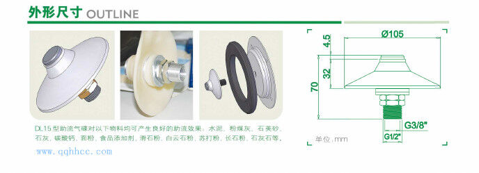 助流氣蝶前部是多孔金屬,外部通入的高壓空氣,經(jīng)過氣嘴后均勻分散在氣嘴周圍,促使粉料流動(dòng),達(dá)到助流效果。流化效果由氣嘴數(shù)量確定,不同的粉料及容器狀況需要不同數(shù)量的氣嘴。本產(chǎn)品具有安裝維護(hù)方便,價(jià)格低廉、流化效果明顯等突出優(yōu)點(diǎn)。 是水泥倉(cāng)頂除塵器,攪拌站倉(cāng)頂除塵器,以及水泥罐倉(cāng)頂除塵器重要元件。