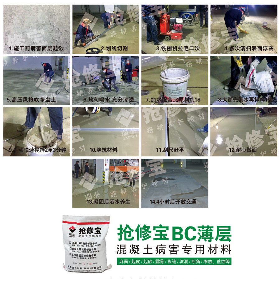 出現(xiàn)這些問(wèn)題的主要原是因?yàn)槭┕べ|(zhì)量和產(chǎn)品本身的使用壽命問(wèn)題,那么針對(duì)這種問(wèn)題,地坪在修補(bǔ)處理基層時(shí)應(yīng)該選擇什么材料呢?首先應(yīng)考慮快速材料,因?yàn)槭堑叵峦\噲?chǎng),車輛需要頻繁進(jìn)入駛出;其次針對(duì)起塵、起砂、脫落的微表處病害,選擇針對(duì)微表處病害的修補(bǔ)材料。搶修寶BC薄層就是一個(gè)不錯(cuò)的選擇,材料本身強(qiáng)度高,內(nèi)含進(jìn)口膠粉,可以和病害部位嚴(yán)絲合縫的結(jié)合起來(lái),其次加入了進(jìn)口添加劑,材料可以30分鐘完成初凝,2-4小時(shí)就可以恢復(fù)交通,解決了車輛進(jìn)出頻繁引起的交通擁堵,是地坪修補(bǔ)基層處理的的不錯(cuò)的選擇!