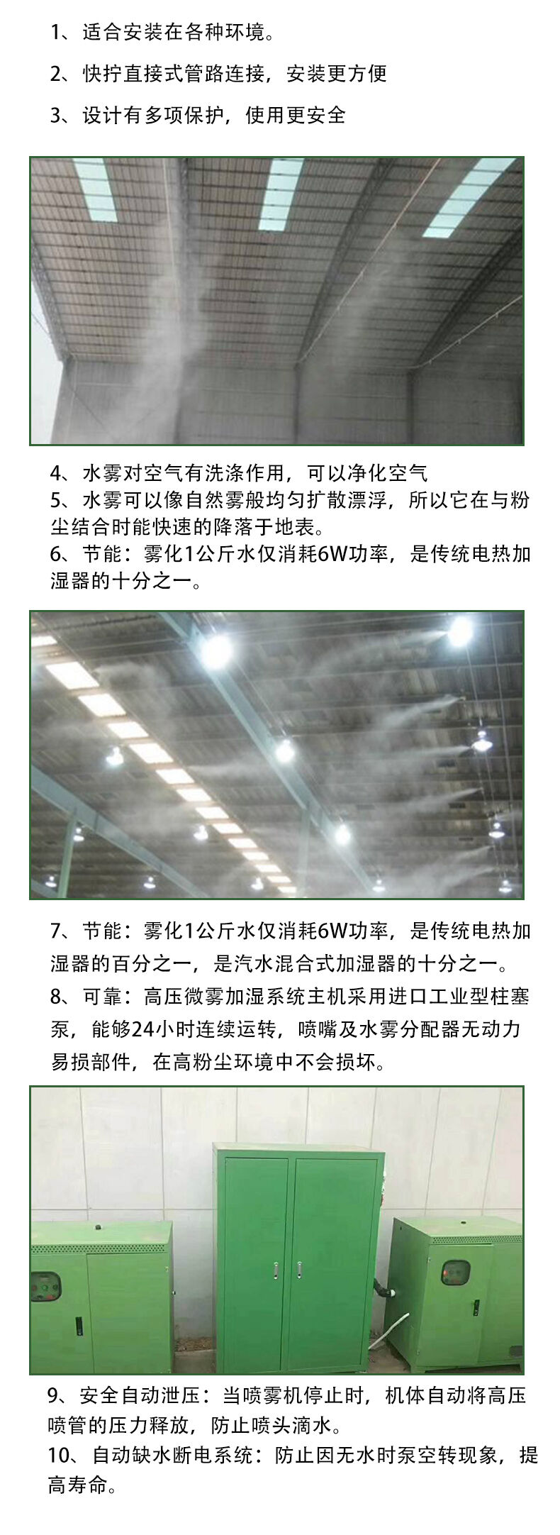 7.可靠:高壓微霧加濕系統(tǒng)主機(jī)采用進(jìn)口工業(yè)型柱塞泵,能夠24小時(shí)連續(xù)運(yùn)轉(zhuǎn),噴嘴及水霧分配器無動(dòng)力易損部件,在高粉塵環(huán)境中不會(huì)損壞
