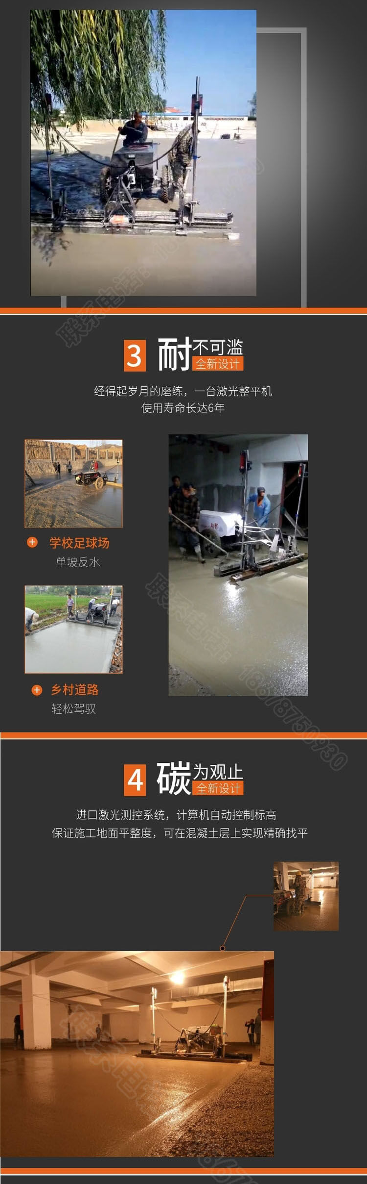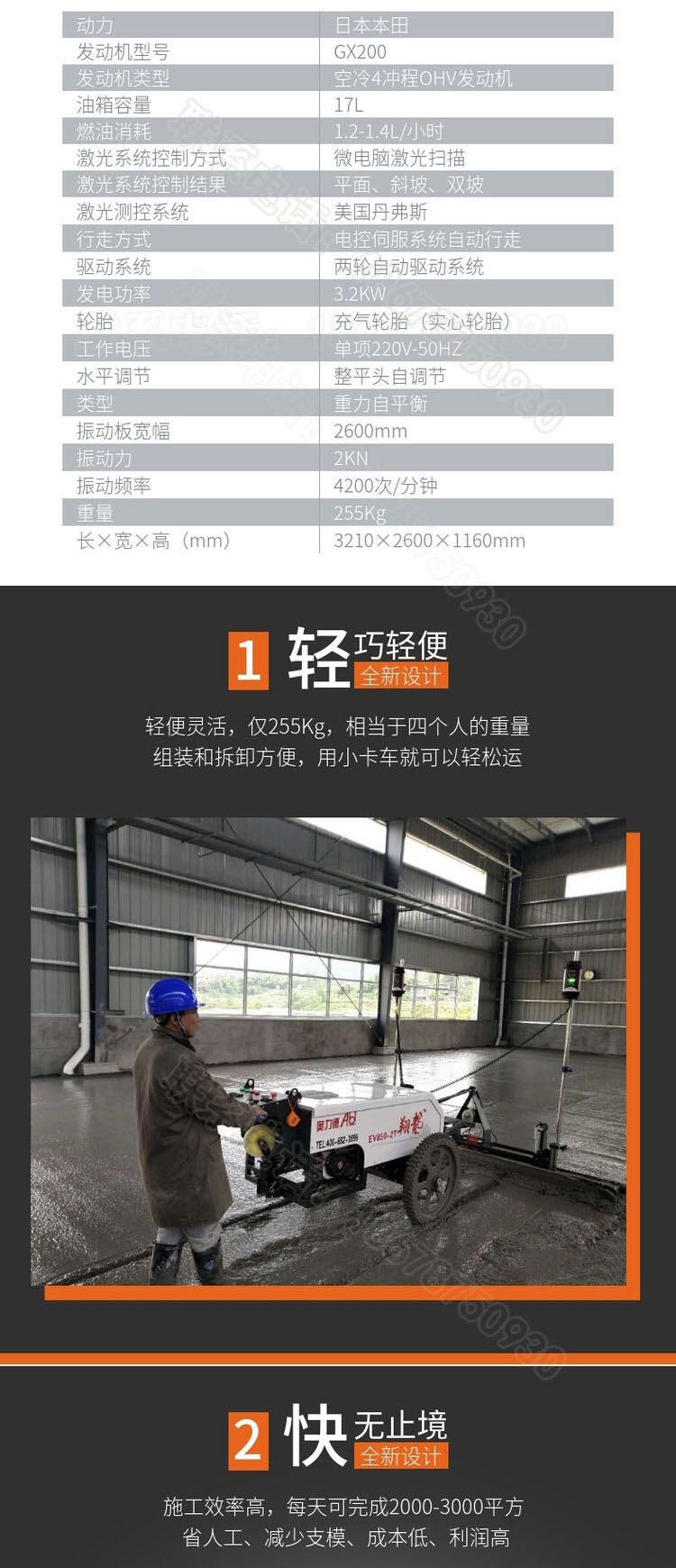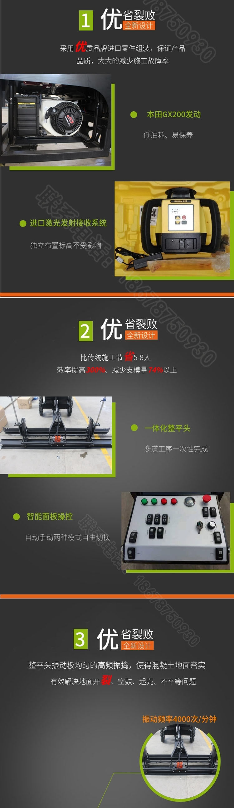 一、減少人力成本,翻倍提高效率:傳統(tǒng)工藝施工人數(shù)較多,需要支模板(槽鋼)、打點(diǎn)、攤鋪。需要人力20人左右。每天施工面積在700平方。采用混凝土激光整平機(jī)總?cè)藬?shù)比傳統(tǒng)工藝減少一多半??蓡稳瞬僮?。每天施工面積在2500平---3500平,大大降低了人力成本。