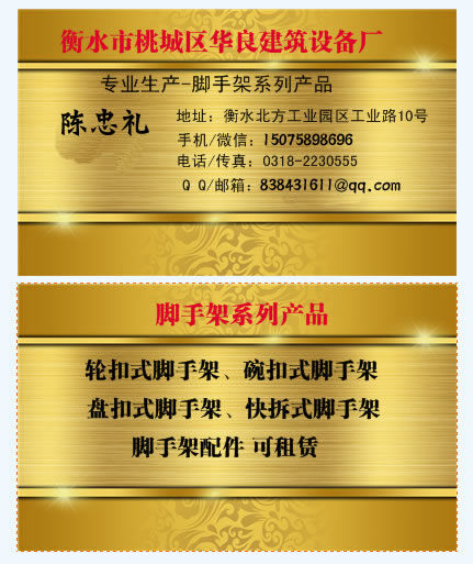 河北衡水華良建筑設備廠是集生產、銷售、租賃于一休的專業(yè)腳手架生產廠家,聯系電話 :150-7589-8696